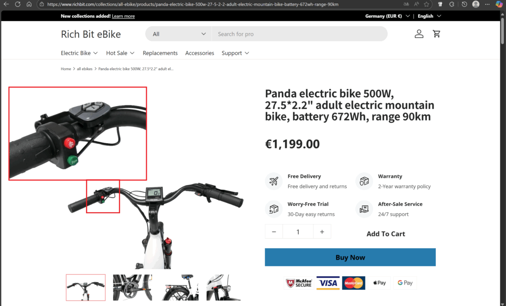 中国・新華南社の公式サイト「richbit.com」で販売されている自転車。赤枠は編集で追加。RICHBIT CITY, RICHBIT CITY ASSISTはこの自転車と全く同型の警音器+ライト一体型スイッチを使っている