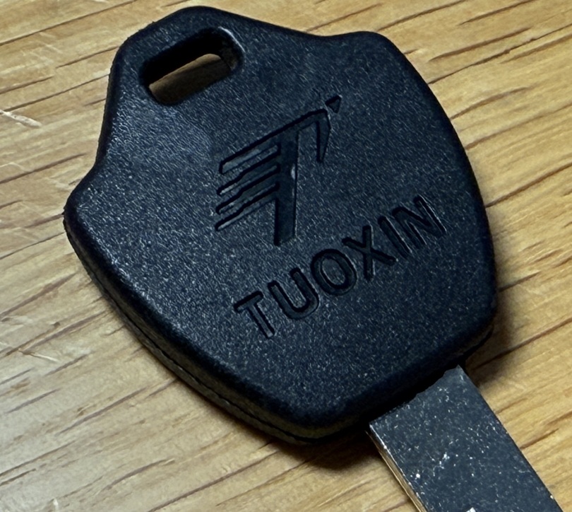 他にも、タイヤはKENDAという台湾のメーカーが製造したもので、バッテリーを開け閉めするための鍵もTUOXINというこれまた中国のメーカーが作っています(特定は難しいですが…)。ちなみに、防犯用のロックはこの自転車にはありません。あの手この手を使ってコストダウンをして、特定小型原付ブームに乗っかって大量流通させんとしているさまがわかるかと思います。